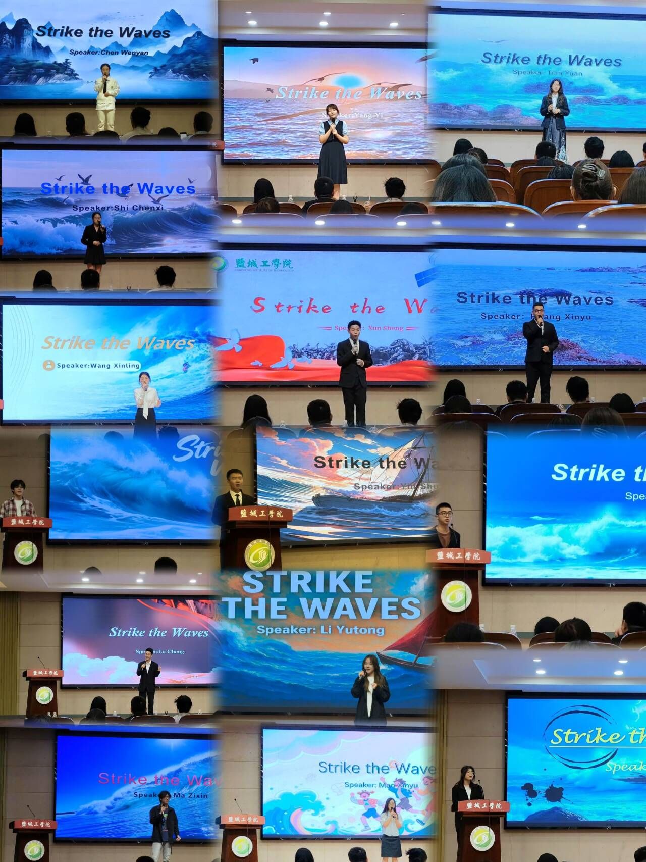 本次比赛全校共有75位同学报名参加,经过初赛和复赛激烈角逐,15位同学进入决赛。决赛分为定题演讲(限时3分钟)与现场问答(限时2分钟)两个环节。 命题演讲环节,选手们围绕“Strike the Waves”这一主题,结合自身经历与思考,用饱满的热情、生动的语言展开阐述。问答环节,评委老师们根据演讲内容进行针对性提问,选手们镇定自如,对答流利, 彰显出良好的应变能力与知识储备。