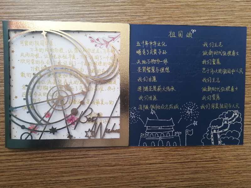 爱国,从来不是靠一两句言语就能实现的,而是要通过自己的实际行动去证明。本次活动旨在以贺卡这种形式为载体,歌颂伟大的祖国,激发同学们的爱国情怀和圆梦动力,引导同学们努力奋发向上,增强同学们克服艰难险阻的能力,从而营造浓厚的校园爱国氛围。