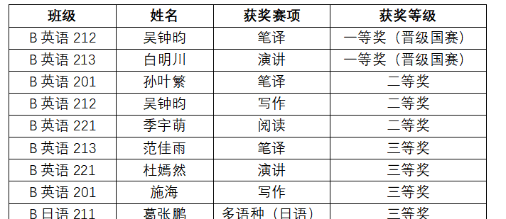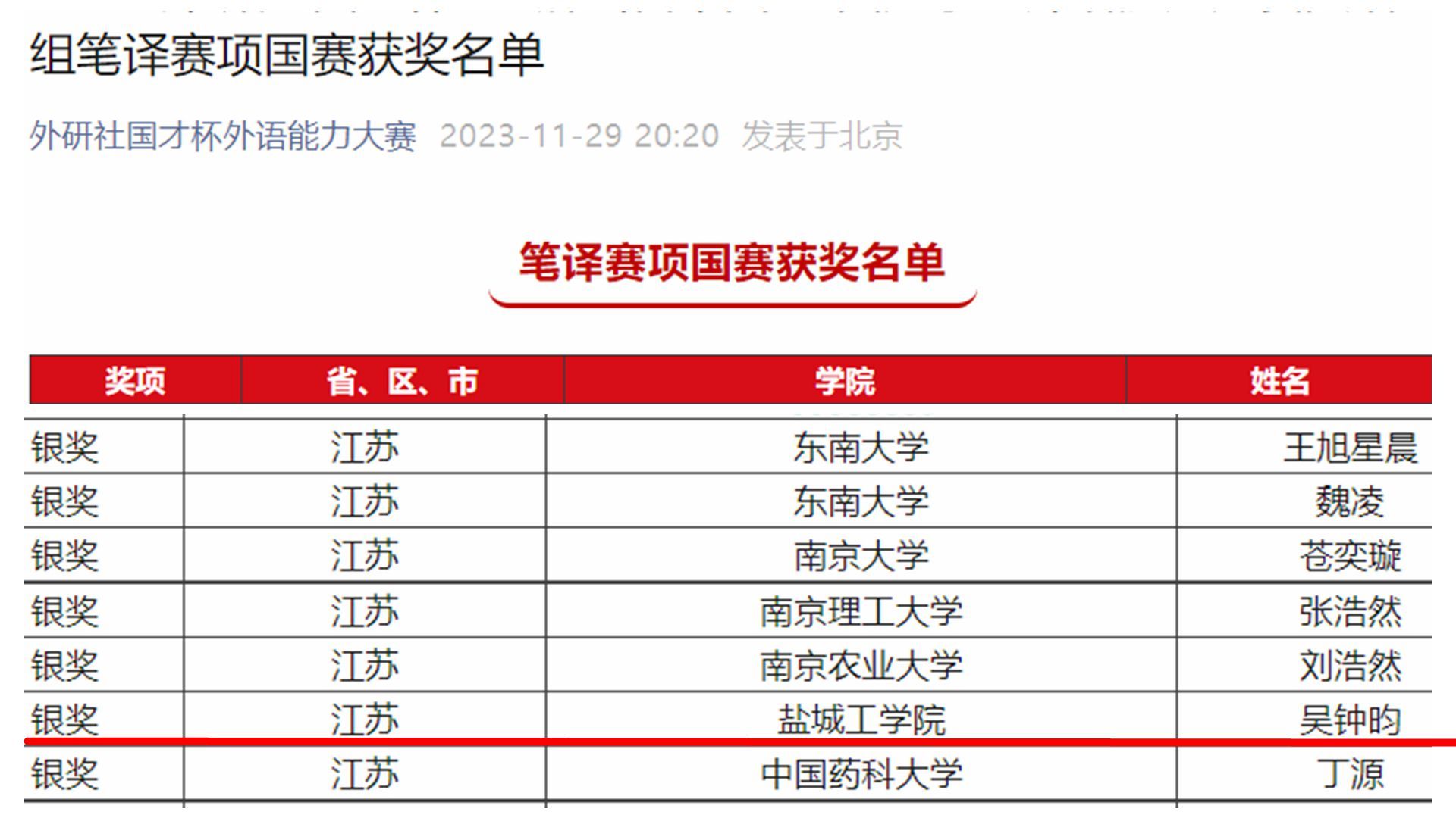 近日,2023“外研社·国才杯”“理解当代中国”全国老员工外语能力大赛获奖名单公布,公司B英语212吴钟昀获英语组笔赛项国赛银奖,B英语213白明川获英语组演讲赛项铜奖。经过前期校赛、省赛选拔,江苏省仅15名选手晋级笔译国赛,24名选手晋级演讲国赛。