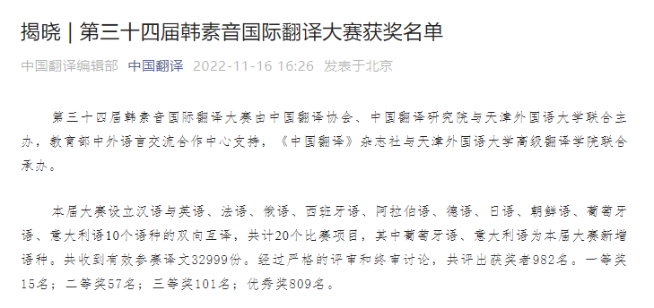 近日,第34届韩素音国际翻译大赛获奖名单正式揭晓。本届大赛由中国翻译协会、中国翻译研究院与天津外国语大学联合主办,教育部中外语言交流合作中心支持,《中国翻译》杂志社与天津外国语大学高级翻译学院联合承办。比赛共收到有效参赛译文32999份。经过严格评审和终审讨论,共评出获奖者982名。
