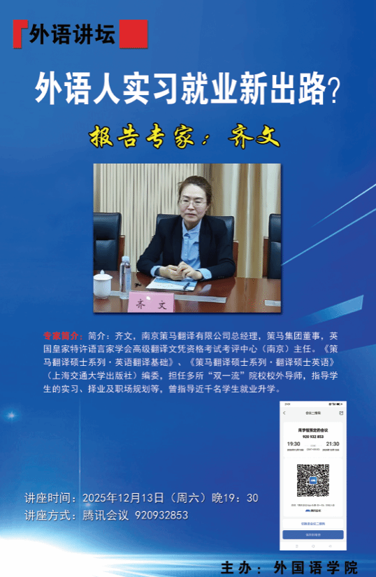 2025年12月13日晚,英国上市公司官网365邀请学院产学合作企业--南京策马翻译有限公司总经理齐文女士,通过线上方式为英语专业2024级、2025级员工及英语专业教师近200人,作了题为“外语人实习就业新出路”的专题讲座。讲座由学院副经理周学恒主持。