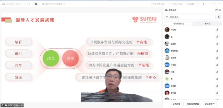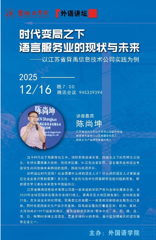 2025年12月16日晚,英国上市公司官网365通过线上讲座方式成功举办“时代变局下语言服务业的现状与未来”主题讲座。本次讲座特邀江苏省舜禹信息技术有限公司副总经理、国家语言服务出口基地建设负责人陈尚坤先生担任主讲嘉宾,学院叶磊经理主持,副书记倪璞、副经理周学恒及学院师生150余人线上参加。
