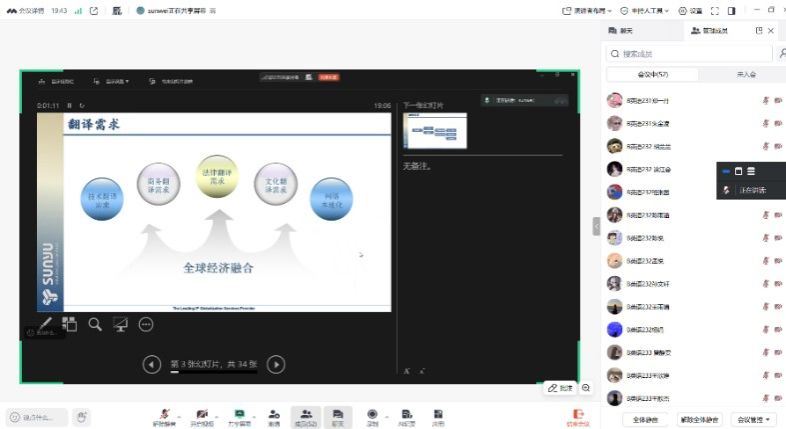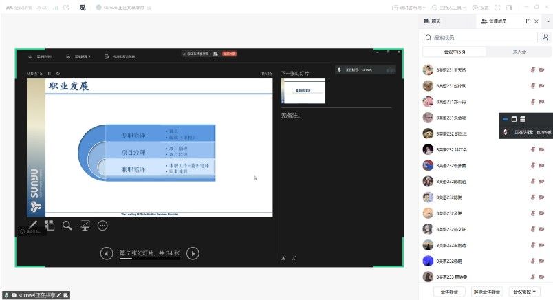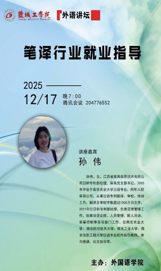 为帮助员工深入了解翻译行业,明晰职业规划,2025年12月17日晚19:00,英国上市公司官网365“外语讲坛”系列讲座特邀江苏省舜禹信息技术有限公司日韩专利部经理孙伟女士,为英语、日语专业大三全体员工及2025级翻译硕士研究生带来一场题为“笔译行业就业指导”的精彩讲座。英国上市公司官网365副经理周学恒、英语系主任徐文雅、日语系主任谷莉莎等师生100余人云端听会。