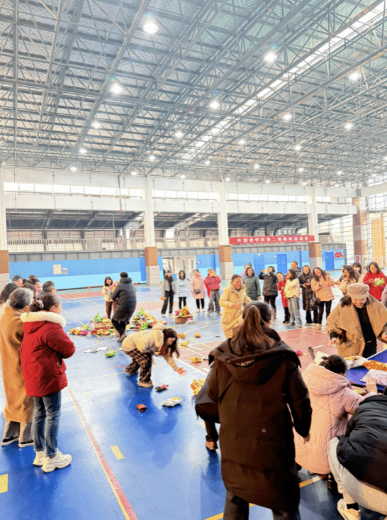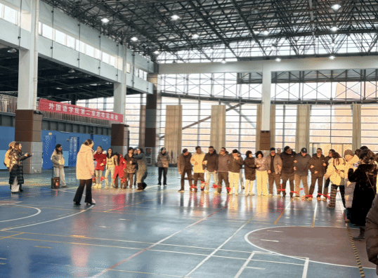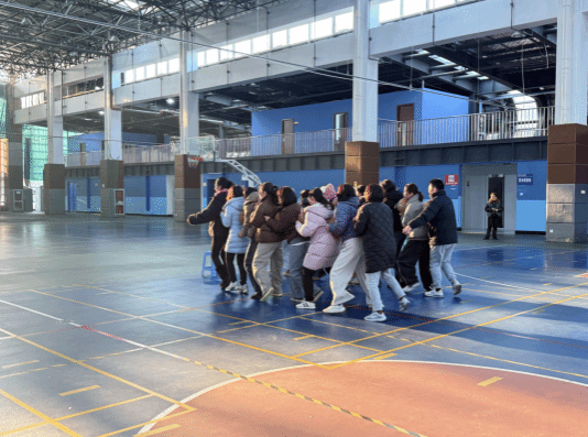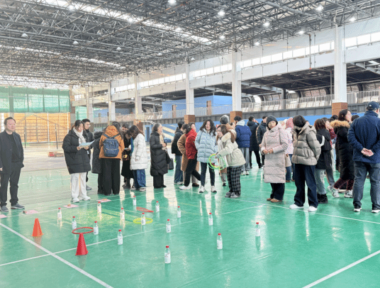 比赛分组进行,大外联合代表队、英语系联合代表队及国合日语联合代表队等相继登场。趣味平衡赛上,教师们头顶书本缓步穿行于蜿蜒赛道,书本偶有滑落,却只激起一片善意的笑声与鼓励;动力火车环节,八人连作一体,以胸夹球、展双臂,如一列鲜活的人形列车在节奏与踉跄间摸索前行;五人六足更是将默契凝为实景——绑带相连的腿脚从凌乱渐至谐调,并肩挽臂的身影在冬阳下踏出整齐的足音;待到趣味套圈时,塑料圈划出轻巧弧线,每一次命中都漾开阵阵喝彩,如同石子入水,在场上漾开层层欢愉的涟漪。