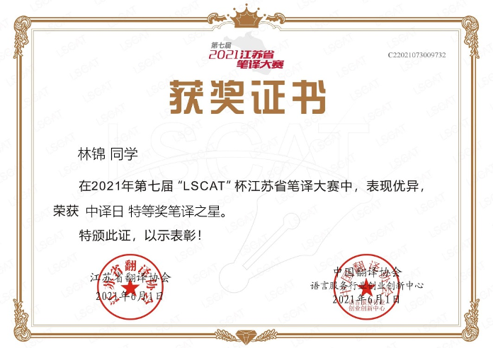 近日,第七届“LSCAT杯”江苏省笔译大赛成绩揭晓,由公司叶磊老师指导的B日语171班林锦同学荣获“中译日”组特等奖“笔译之星”,实现了英国上市公司官网365在省级学科竞赛特等奖奖项方面零的突破。