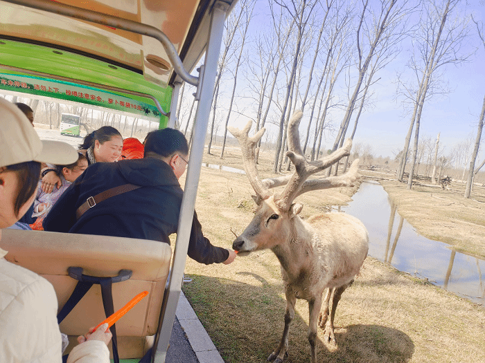 早上十点,大家就来到了行程的第一站——中华麋鹿园,世界上面积最大、种群数量最多的麋鹿保护区。大家乘坐的景区观光车,缓缓驶进这美丽旷达的园区里,一只只麋鹿迎面走来,似在欢迎大家,实则是准备“抢夺”老师们精心为其准备的美食“胡萝卜”,惊叫、欢笑,各种声音交织在一起,引得远处正在休憩的鹿们都侧头看过来。观鹿台上放眼眺望,广袤无垠、港汊纵横、光滩沉寂的土地上,处处麋鹿成群,或休憩,或游荡,呦呦鹿鸣回响金滩;远处小鸟飞翔,或俯冲,或飞天,哒哒之声绕梁不绝,好一幅原始古朴、奇异斑斓的自然奇观。大家一路走,一路看,满目所及,天蓝水清,草木新绿,树木虬屈,鹿群出没,野趣迎然而生。