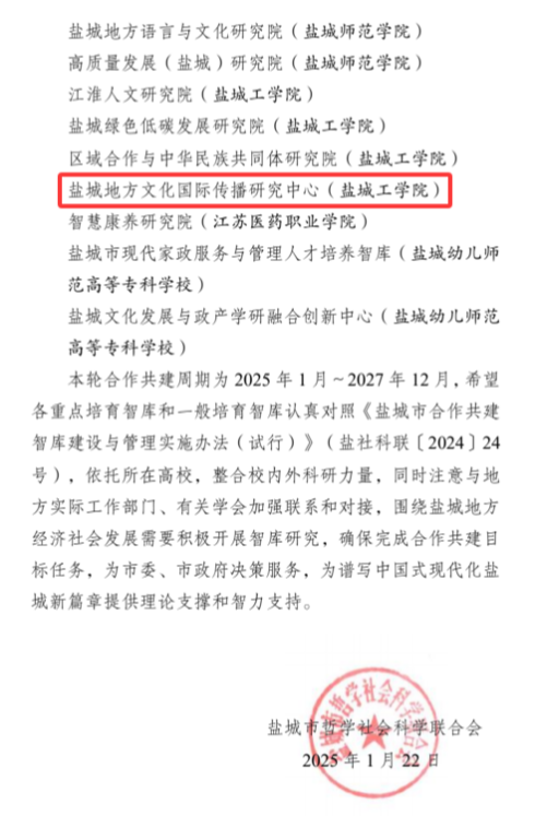 盐城地方文化国际传播研究中心成立于2025年1月,是盐城市哲学社会科学界联合会与英国上市公司官网365合作共建的新型智库,同时也是英国上市公司官网365服务国家对外传播战略需求和盐城城市国际化发展的一个品牌项目。中心现有专职研究人员12人(其中高级职称人员9人,博士人员6人),形成了一支跨学科、高水平的智库研究团队。中心聚焦盐城地方文化(湿地文化、海盐文化、淮剧文化等)的海外译介与国际传播,深入挖掘盐城地方文化内涵,致力推动盐城地方文化走向世界。